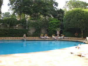 In Mumbai, we booked a room at the Taj Mahal Palace and Tower hotel.  We arranged transfers from the airport through the hotel and our car was there to pick us upon arrival.  Due to the bombings last year, when we arrived at the hotel, we had to clear security much like the security at an airport before we could enter the hotel.  We were taken to our room for check-in.  All the paperwork, etc. was prepared before we arrived.  Lovely!  We had a perfect location on the 15th floor and overlooked the Gateway to India.  The Palace section was still not fully open as repairs from the bombing had not been completed, but the areas we did see were magnificent.  The pool area was spectacular but I’m not sure it would be large enough to accommodate all guests when the whole hotel is open.  The restaurants were excellent.  This would definitely be our first choice of accommodations if we were to return to Mumbai.