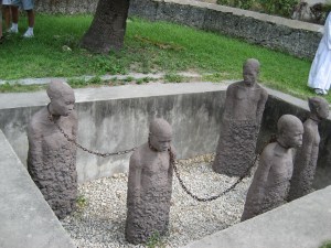 We went on the Sultan Heritage tour which was not exactly as described in the tour booklet but was excellent.  The busses were small and ours could have held about twenty passengers.  The guides, dressed in kanzus (a white garment that covers from neck to ground) and kofias (the small hats), were all standing outside the vans holding numbers on sticks so that we could find the correct busses. We had fourteen passengers, a driver, and our guide, Taib, who said to call him Mr. T (though he said a smaller version and with no bling).  Taib was a fantastic guide and he managed to convey the history, traditions and culture of his island during our four hour tour.  We began with a drive past the market.  All of the women we saw on the street were dressed in either a buibui (worn over a dress) or khanga (the two piece outfit that covers from head to waist and then from waist to ankles).  Some barely had their eyes showing, others revealed their whole face.  The men were mainly dressed in pants and shirts and many wore  kofias.  We proceeded to the Anglican Church Cathedral (the former slave market site).  The church continues to be used and the woodwork, artwork, and second oldest organ in Africa were in remarkable condition.  History of the East Africa slave trade was brought to life as we were taken to the underground chambers where slaves were held.  Taib stated bluntly what life was like for the slaves, how their worth was determined, and the conditions and treatment they were subjected to by the slave traders/owners.  Outside in the courtyard, is a sculpture project by Clara Sornas in “Memory For The Slaves”.  It was an intense, moving experience.