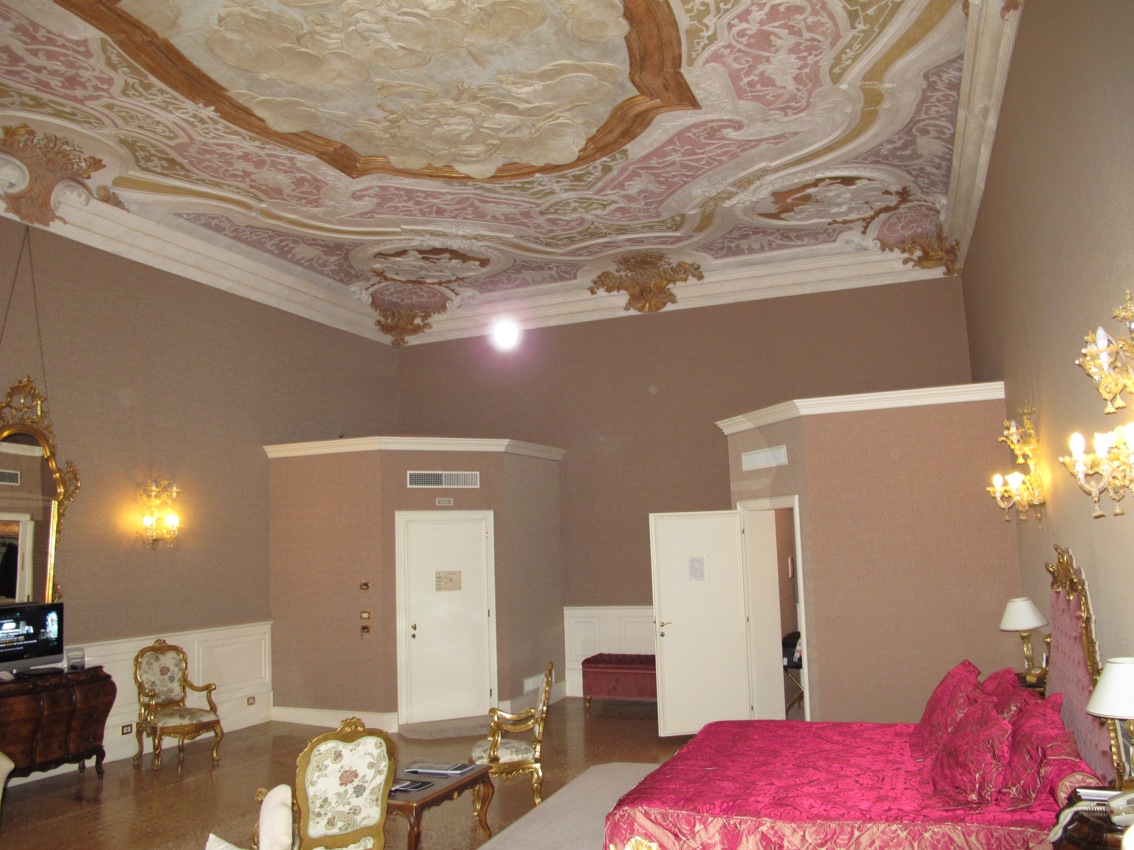 Our room was ready shortly before the check in time of 2:00 p.m. What a room! We were taken to Room 204, the Sala di Sebastiano Ricci (now called the Historical Grand Suite). The whole ceiling was a stuccoed masterpiece; antique furniture/fabrics/decor and Murano glass replicated the ambiance of the 17th century. The modern bathroom appeared to be recently renovated and provided us with the luxurious amenities one finds in any five star hotel. Windows that opened allowed us views over Campo Santa Sofia as well as side views of the Grand Canal and the gondola station.