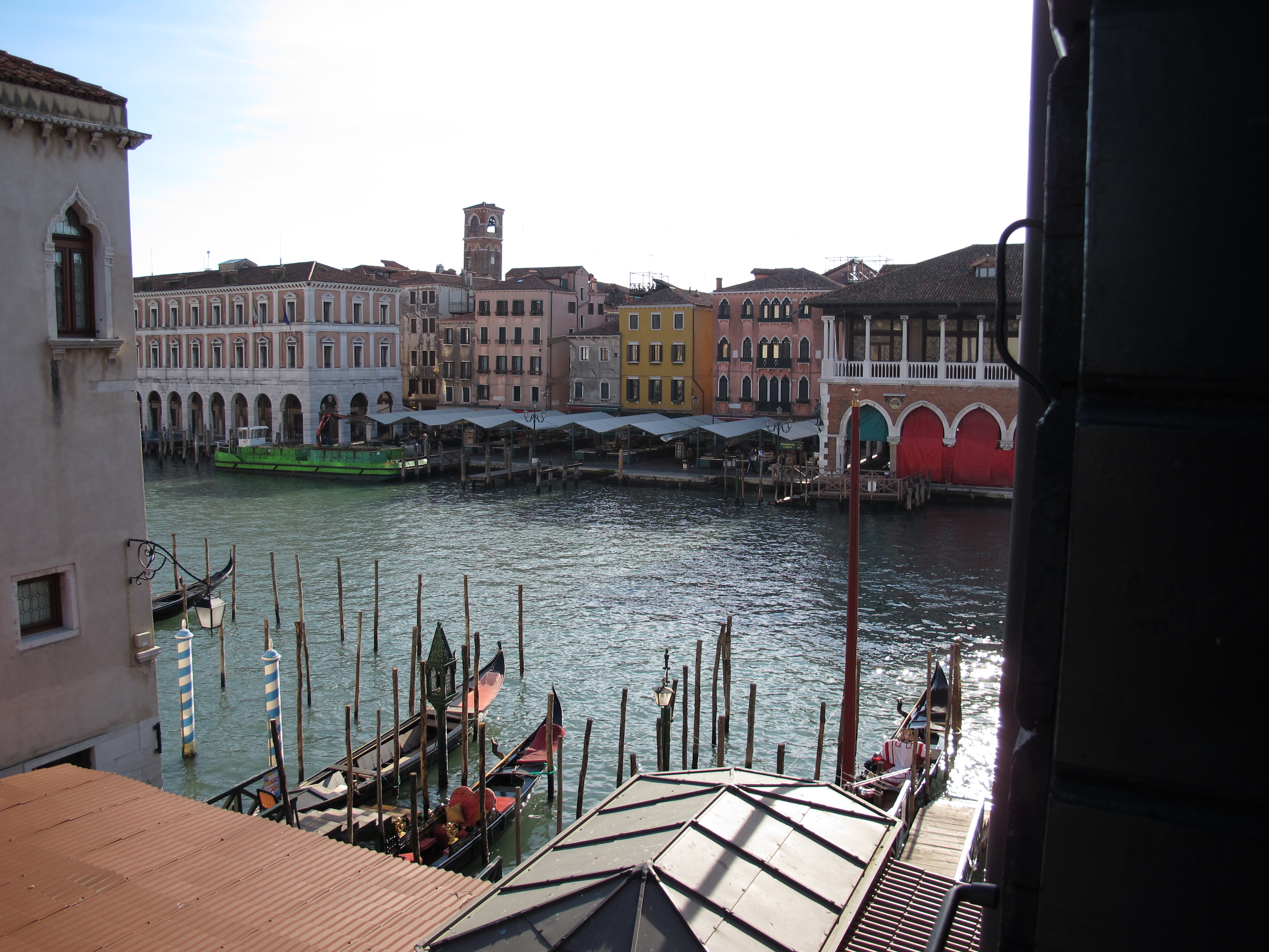 We were early so our room was not ready. It was not, however, too early to enjoy a glass of wine on the terrace. We sat mesmerized by the scene in front of us – the Grand Canal. To the left was a gondola station; to the right was a vaporetti stop; across the river was the market; and everywhere we looked was a panoramic photograph waiting to be taken.