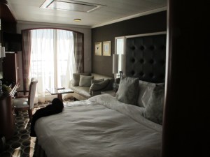 We were taken to a dock at the Stazione Marittima in the same area as the Crystal Serenity.  Porters and Crystal personnel met the water taxi.  We had a very short walk to the terminal and, within minutes, were boarding the ship for our first Crystal cruise.  We were greeted by a variety of staff and crew.  Our hand baggage was taken by a crew member who showed us where we could leave the bags. We checked the hand luggage in at a table on Deck 5 and we did not see it again until it was in our cabin.  We really appreciated this service as usually we carry the bags from place to place until the cabin is ready.  As was noted in our pre-cruise documents, the cabins were not ready until 3:00 p.m. but lunch was available on Deck 12.  First, we went up to deck 13, received a tour of the gym and the spa and I booked a spa appointment.  Then, after a quick bite to eat from the Trident Grill on Deck 12, we went down to our cabin where our bags were waiting on the bed.  When we walked in to the cabin, we couldn’t help but compare it to our basic suite on Regent.  It was going to take some time to get used to the Crystal Serenity in a 269 sq. ft. cabin (verandah included). The whole cabin area is open and, as we tend to have different hours, we weren’t sure how we’d be able to move about without disturbing the other person. There was also a storage space issue; where could we possibly fit all of the clothes that we had brought for our extended journey?  The closet was not walk-in and, from the exterior, appeared tiny (looks can be deceiving).  There did not appear to be many drawers or storage compartments.  Our next concern was the living area.  The love seat appeared tiny (sometimes, looks are not deceiving).   Well, we kept an open mind and I am pleased to report that our three suitcases full of clothes and all of our shoes fit within the allocated space.  We switched  most of the wooden hangars for the smaller metal type and made use of every inch of the closet.  Although I didn’t like the design of the closet, it worked.